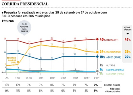 Según los datos de la consultora Ibope, en dos días Dilma creció dos puntos porcentuales si se toma el universo de los votos válidos -que excluye blancos, anulados e indecisos- llegando al 47%. Marina Silva, que luego de un fulgurante ascenso a partir del fallecimiento de Eduardo Campos parecía encaminarse a disputarle el lugar en el Planalto a la Presidenta, viene en franco descenso, y bajó un 1% más, de 29 a 28% de los votos válidos, en tanto el candidato del PSDB, Aécio Neves, se mantiene en el 22%.