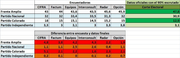 La empresa con mayor nivel del error fue CIFRA. Las de menor nivel fueron Opción y RADAR. Mientras el sociólogo Luis Eduardo González, luego de conocidos los datos oficiales y su proyecciones siguió insistiendo sobre un pronóstico complejo para el Frente Amplio en el balotaje, Equipos reconoció que había fallado y dijo que se debía pensar en la revisión profunda de los sistemas de encuestas.