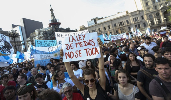 Militantes del FpV, intendentes, representantes de medios comunitarios, organizaciones gremiales y autoconvocados confluyeron en la Plaza de los Dos Congresos, donde realizaron un acto en defensa de esa norma, la Ley de Servicios de Comunicación Audiovisual, en el que también cuestionaron las últimas medidas económicas adoptadas por el Gobierno, al igual que la designación de dos ministros de la Corte Suprema mediante un decreto presidencial.18 DIC, 2015