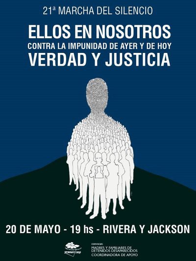 Una nueva Marcha del Silencio se realizará este viernes y otra vez los rostros de aquellos que fueron desaparecidos por el terrorismo y la impunidad del Estado encabezarán la columna que atravesará 18 de Julio desde Rivera y Jackson hasta Plaza Libertad desde las 19 horas. En su vigésimo primera edición, Madres y familiares de uruguayos detenidos desaparecidos no tiene "buenasnuevas" que comunicar. A pesar de ser un día de "encuentro y memoria" y una jornada "especial para todos los uruguayos, dentro del país y fuera de él", desde la recuperación institucional en 1985 pesa sobre las organizaciones sociales que trabajan en el esclarecimiento de los crímenes de Estado el dolor de las "mil y una piedras" que han interpuesto los sucesivos gobiernos.