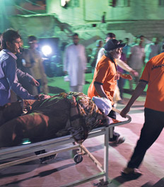 Rescatistas paquistaníes evacuan a un hombre herido del templo después del atentado.