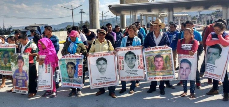 Los padres están al frente con los cartelones y las fotos de sus hijos: Abel García Hernández, 19 años… Mauricio Ortega Valerio, 18 años… Jonas Trujillo González, 20 años… Magdaleno Rubén Lucero Vargas, 19 años… Leonel Castro Abarca, 18 años… César Manuel González Hernández, 19 años.