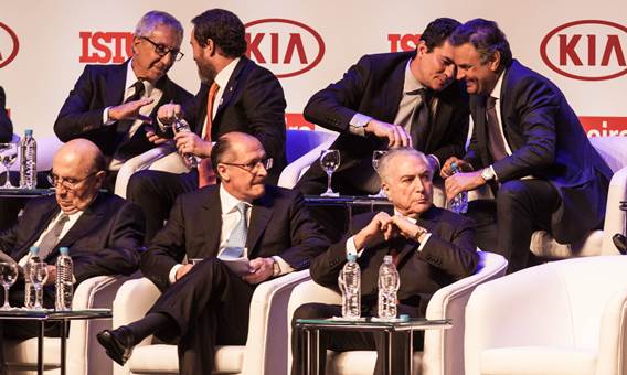 (Moro a las risas con Aécio Neves -arriba a la derecha-. en primera línea: ministro de Hacienda, Henrique Meirelles; gobernador de San Pablo, Geraldo Alckmin; presidente Michel Temer / FOLHAPRESS)
