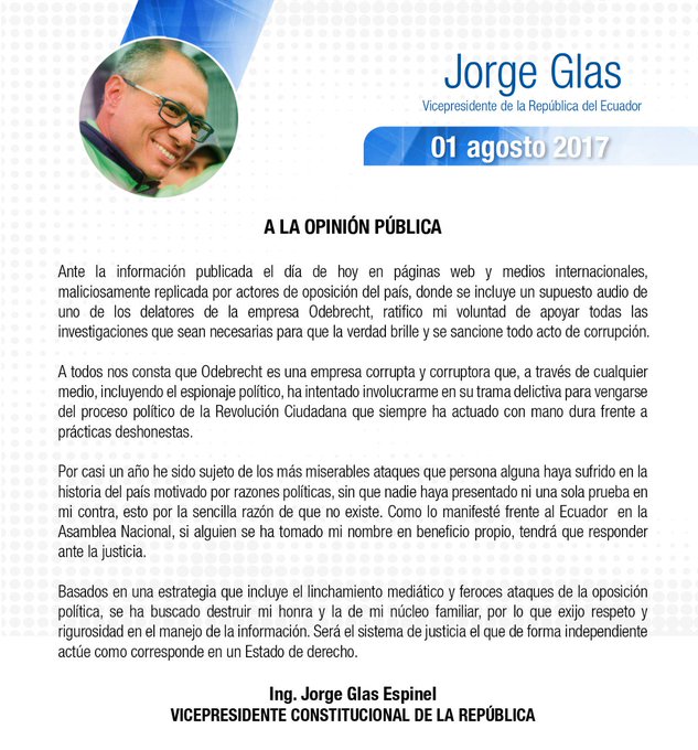 Según informa El Comercio de Ecuador, Moreno había advertido que tomaría decisiones en torno a los casos de corrupción en los que ha sido mencionado el Vicepresidente, luego de que se difundieran dos audios de la investigación a Odebrecht, en los que se señalaba supuestamente a Glas como parte de una trama de sobornos. Información que fue desmetida por el propio Glas a través de un comunicado..