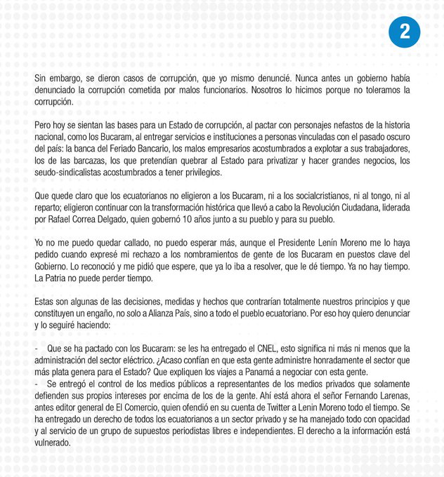 A través de un comunicado el mandatario aseguró el funcionario electo como su compañero de fórmula en las pasadas elecciones “no entendió” el compromiso de la Revolución Ciudadana que “implica servir a la patria en unidad de esfuerzos”.