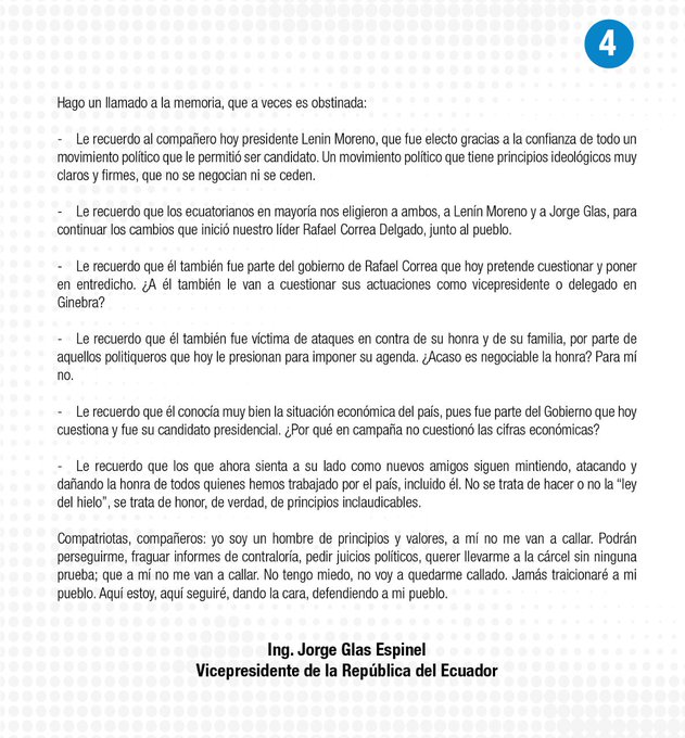 Tras conocer el retiro de todas las funciones Glas, Correa se manifestó en su cuenta de Twitter y expresó: “Ups! ¡El “diálogo” sólo ha sido para los que odian la Revolución!. Adelante, JORGE. Tómalo como una condecoración”. En referencia a las cuestionadas negociaciones de Moreno con la oposición y la falta de respaldo al vicepresidente ante las acusaciones.