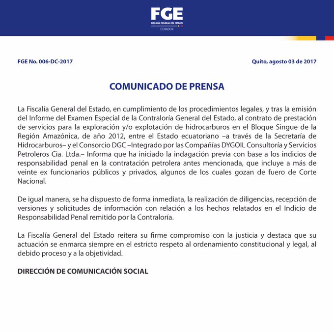 La Fiscalía General del Estado publicó en su página oficial un comunicado en el que especifica que la investigación se trata de una contratación petrolera en el Bloque Singue de la Región Amazónica.