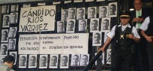 La protesta inició poco después de las 9 de la mañana. Los periodistas colocaron en las escalinatas de la entrada a Segob fotografías de Cándido, al que sus colegas llamaban cariñosamente “Pavuche”.