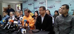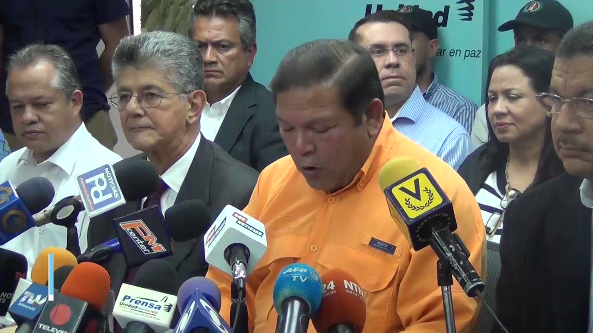 El dirigente Andrés Velásquez leyó un comunicado de la MUD en el que anunció que acordaron, “por consenso, preinscribir candidatos para las elecciones regionales vencidas y escamoteadas por el régimen”.