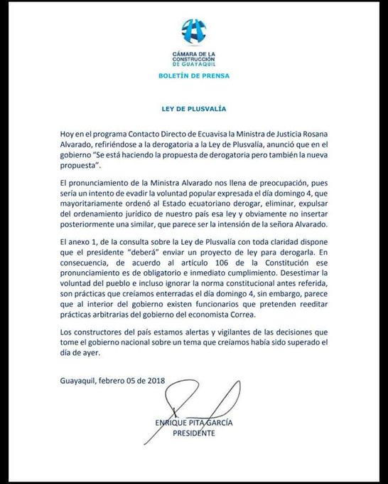 Marco Navas@MarcoAnibalCámaras de la construcción exigen derogación de ley de Plusvalía mas no promulgación de ley que la suplante tal cual la pregunta de la consulta popular