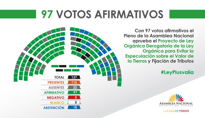 Con 97 votos afirmativos el Pleno de la Asamblea Nacional aprueba el proyecto de Ley Derogatoria a la #LeyPlusvalía.
