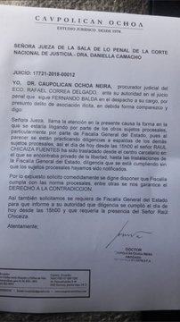 Cartas de Raúl Chicaiza a Correa, donde le dice que ha sido procesado en Colombia. "Lo único que pretendo es que escuche mi ruego y mi súplica, para que usted de una vez por todas se entere de esta irresponsabilidad, de lo que está sucediendo", asegura en una de las misivas.