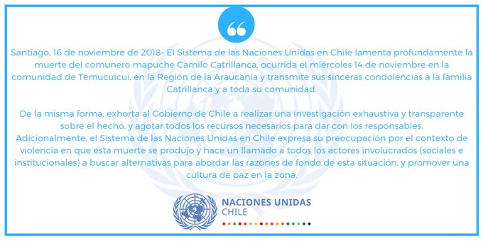 “El Sistema de las Naciones Unidas en Chile lamenta profundamente la muerte del comunero mapuche Camilo Catrillanca, ocurrida el miércoles 14 de noviembre en la comunidad de Temucuicui, en la Región de la Araucanía y transmite sus sinceras condolencias a la familia Catrillanca y a toda su comunidad.