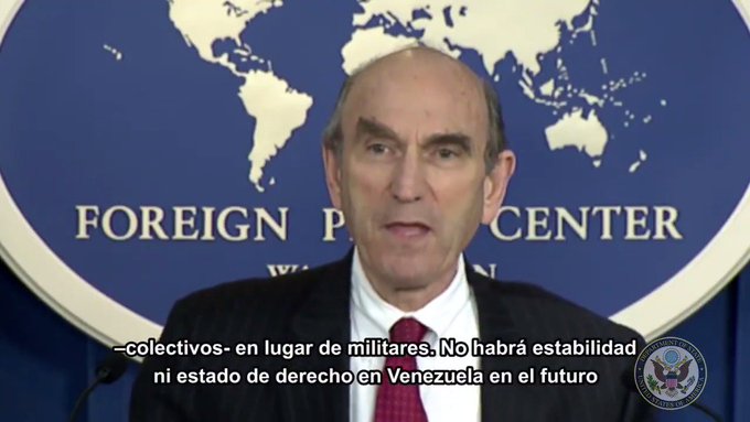 Representante Especial Abrams: No habrá estabilidad ni estado de derecho en Venezuela en el futuro si pandillas armadas reemplazan al ejército como una institución. Es algo que estamos discutiendo con los militares venezolanos. Es hora de que defiendan la constitución venezolana.