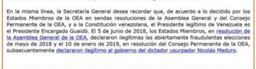Asimismo, denunció que este anuncio de Almagro carece de fundamentos y que solo pretende accionar planes injerencistas y una intervención militar en Venezuela, además de destacar que no es competencia de la OEA reconocer ningún Gobierno del mundo, en referencia a la manifestación de apoyo que el secretario extendió al representante de la oposición venezolana, Juan Guaidó.