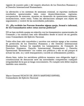 Dijo también en un comunicado que no enfrenta investigaciones penales ni disciplinarias, y que corresponde a las autoridades judiciales evaluar los documentos que llevaban su firma, debido a que en la brigada donde estuvo dos años, sus responsabilidades eran administrativas y no de operaciones de combate.