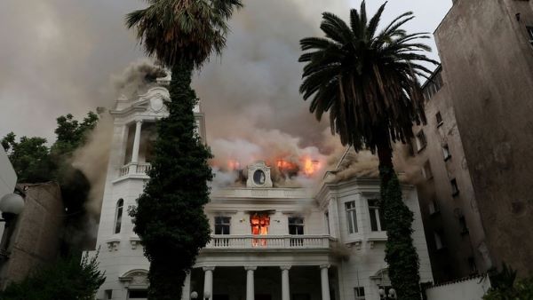 La casa patrimonial, construida en 1915, comenzó a arder por el techo cuando manifestantes encapuchados se enfrentaron con agentes antimotines que habían encendido barricadas en los alrededores, indicaron testigos a medios locales.