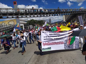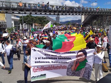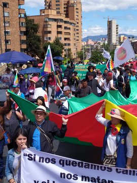 Columnas indígenas llegaron desde varias zonas del país para marchar desde la Universidad Nacional hacia la céntrica Plaza de Bolívar. En ese punto la Guardia Indígena, conformada por adultos líderes de la comunidad, encabezaron la protesta sujetando la "chonta", un bastón de mando que simboliza su autoridad. Llegaron a Bogotá después de varias horas de viaje portando banderas whipalas y carteles con mensajes como "Colombia despertó" y "Resiste". "Hoy se moviliza la dignidad del pueblo colombiano, hoy se movilizan los pueblos indígenas de Colombia en defensa de la vida, La Paz, los territorios y en contra del 'paquetazo' de Duque", afirmó el Consejero Mayor de la Organización Nacional Indígena de Colombia (ONIC), Luis Kankui. Las comunidades indígenas también pidieron que no se los siga matando. Sus líderes denuncian que se convirtieron en objetivo militar de grupos armados ilegales en la convulsionada región del Cauca (suroeste).