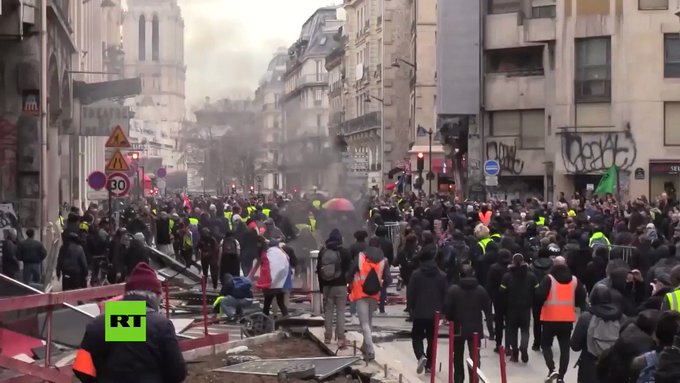 Unos 300 seguidores de los "chalecos amarillos" se concentraron antes de la movilización en la plaza de la Bolsa de París. Allí estuvo Jérôme Rodrigues uno de los fundadores del movimiento, quien hizo una crítica a la propuesta de reforma de las pensiones. Desde allí, caminaron por las calles de París hasta la Estación del Norte, para unirse a la marcha convocada por los sindicatos.