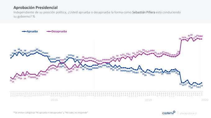 De acuerdo con la encuesta realizada por Plaza Pública de la consultora Cadem, al inicio de este 2020, la desaprobación a la gestión de presidente de Chile, Sebastián Piñera, se mantiene en 80 por ciento.