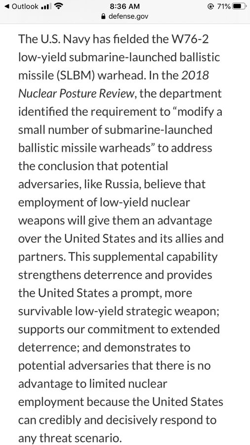 Pentagon finally officially confirms the US has deployed a low-yield, submarine-launched nuclear weapon, the first new American strategic weapon in decades. Statement from John Rood: "This supplemental capability strengthens deterrence...