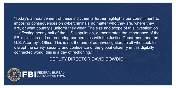 Por su parte, el FBI publicó en Twitter los nombres de los militares. "Wu Zhiyong, Wang Qian, Xu Ke y Liu Lei enfrentan cargos de fraude informático, espionaje económico y fraude electrónico por su papel en uno de los mayores robos de información de identificación personal por parte de piratas informáticos patrocinados por el estado".