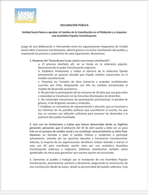 Asimismo, desde Unidad Social hicieron un llamado a “trabajar en la instalación de una Asamblea Popular Constituyente, plurinacional, paritaria y decolonial; asegurando la construcción de una Constitución desde las bases, desde la pluriversidad del pueblo soberano”, la que debería ocurrir a continuación del plebiscito del mes de abril.