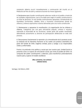 Unidad Social reiteró su apoyo “a la movilización y la organización de los chilenos y chilenas”, y añadieron que “trabajamos por una gran articulación popular, unitaria e inclusiva, valorando la diversidad de los territorios, siendo parte del pueblo movilizado”.