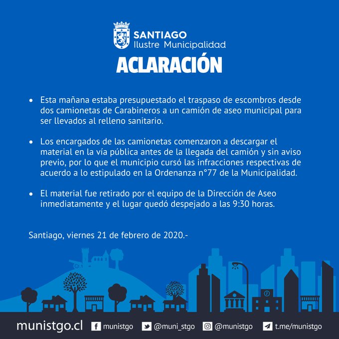 Asimismo, Carabineros emitió una “aclaratoria”, en la que señalaron que “las imágenes corresponden a una actividad realizada con la Municipalidad de Santiago a fin de retirar escombros”.
