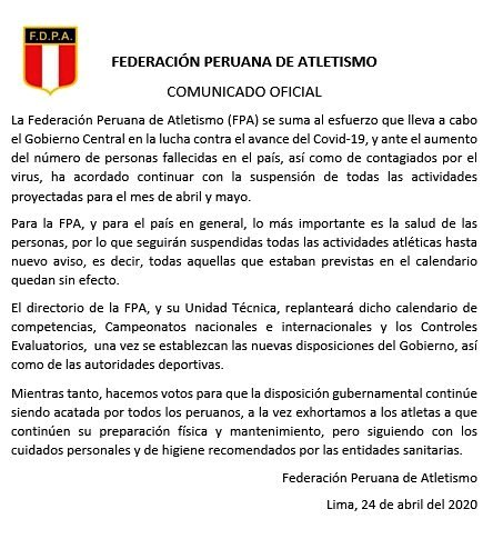 En comunicado publicado en la página de fan page, la Federación Peruana de Atletismo (FPA) anunció que continuará con la con la suspensión de todas las actividades proyectadas para el mes de abril y mayo.