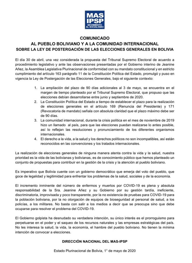 Comunicado del MAS-IPSP, al pueblo boliviano y a la comunidad internacional, sobre la Ley de Postergación de Elecciones Generales en #Bolivia