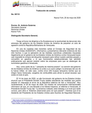 Hoy alertamos al Consejo Seguridad ONU y al Secretario General, @antonioguterres sobre amenaza de uso inminente de la fuerza militar por parte de EEUU contra barcos iraníes con gasolina dirigida a Venezuela. Un acto de guerra establecido en el derecho internacional.