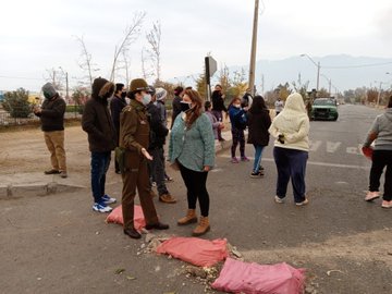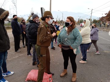 #PuenteAlto: en la intersección de calle Troncal con Bahía Inglesa, un grupo de personas se encuentra interrumpiendo parcialmente el tránsito vehicular. Carabineros dialoga con las personas para que depongan su actitud, considerando el riesgo sanitario de las aglomeraciones.