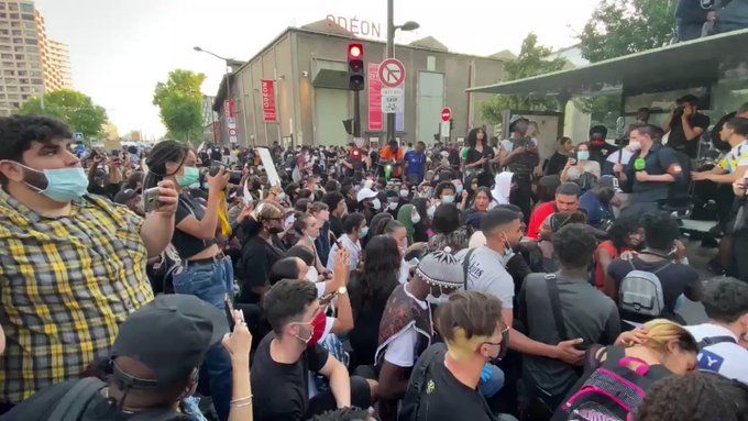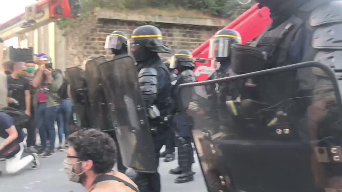 Lors du rassemblement #JusticePourAdama devant le #TGI de #Paris, les manifestants demandent aux forces de l’ordre de se mettre à genoux. #AdamaTraoré #Manifestion #Police
