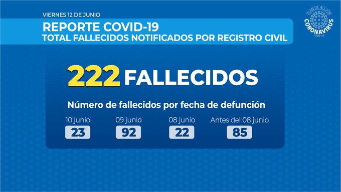 Esta cifra corresponde a 23 muertes el 10 de junio, 92 decesos el 9 de junio, 22 fallecimientos del 8 de junio y 85 ocurridos antes de esa fecha.