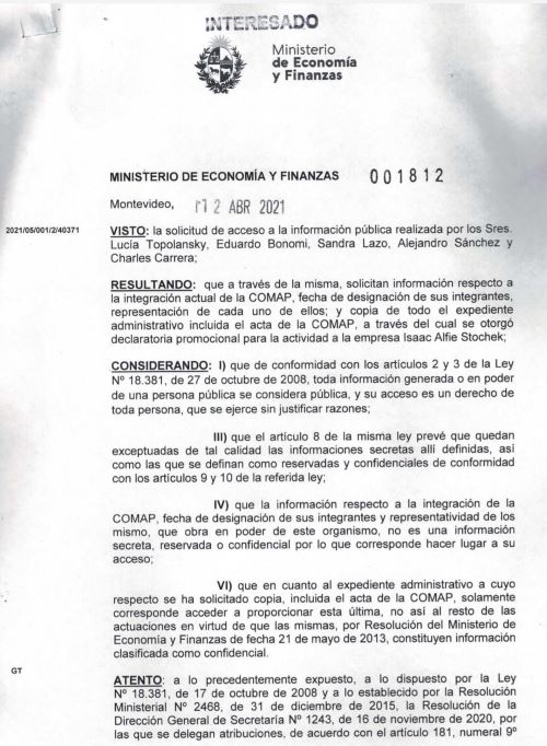 Como informáramos este martes, el Ministerio de Economía denegó un pedido de acceso a la información presentado por senadores del Frente Amplio, donde se pedía información sobre las exoneraciones que había recibido la empresa del director de la Oficina de Planeamiento y Presupuesto, Isaaac Alfie.