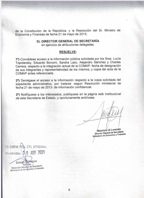 "Deniégase el acceso a la información respecto a la copia solicitada del expediente administrativo, por tratarse -según resolución ministerial de fecha 21 de mayo de 2013- de información confidencial", expresa el numeral 2° de la resolución de Ministerio de Economía y Finanzas, firmada por el director general de Secretaría de la cartera.