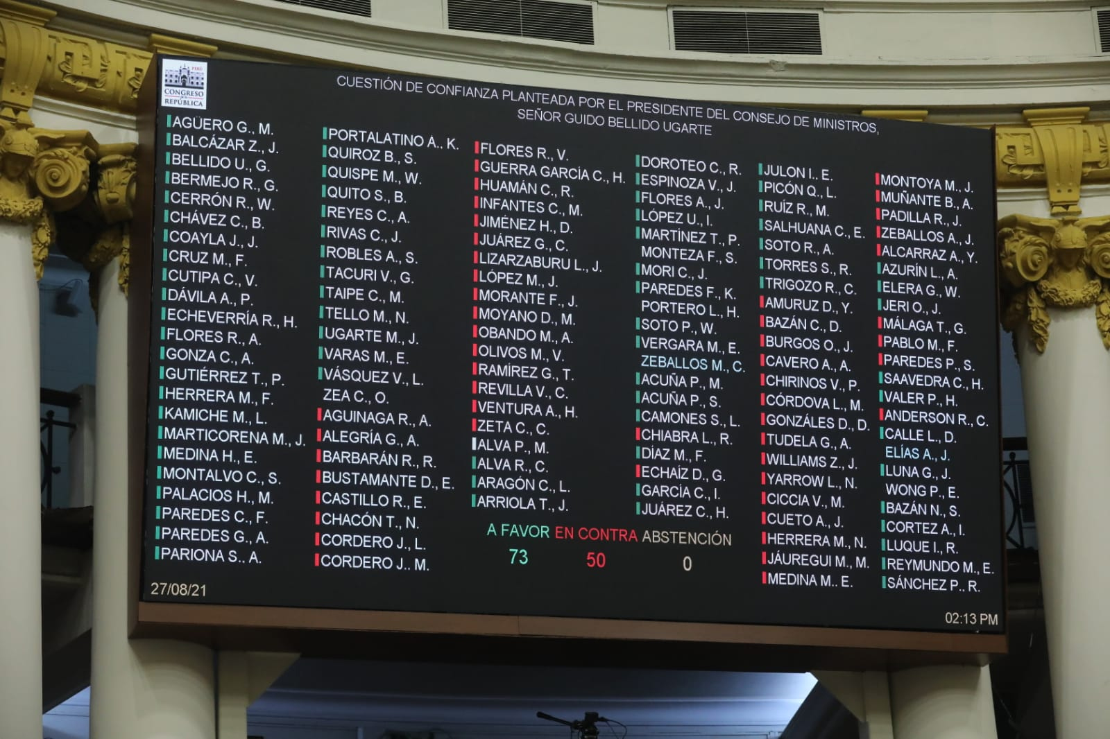 El viernes, el Pleno del Congreso unicameral y mayoritariamente derechista , que criticó duramente algunos anuncios oficiales relacionados con la reactivación de la economía y el combate a la pandemia de coronavirus, otorgó la confianza al Gabinete Bellido con 73 votos a favor, 50 en contra y 0 abstenciones.