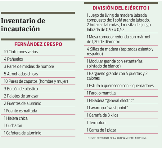 Un importante número de expedientes de detenidos que se encuentran en los Archivos Judiciales procedentes de la Justicia Militar (Ajprojumi) detallan cómo fue el proceso de detención y enajenación de los bienes de los presos políticos. Lo mismo ocurre con las investigaciones elaboradas por la Secretaría de Derechos Humanos para el Pasado Reciente, que aportan datos coincidentes a los de Ajprojumi.