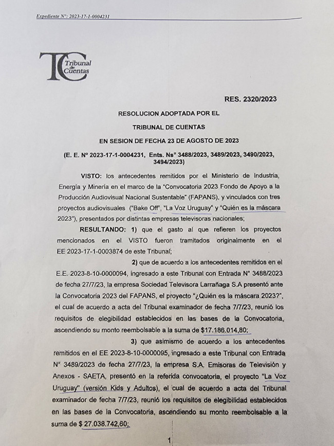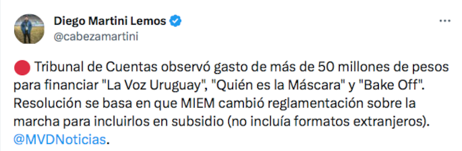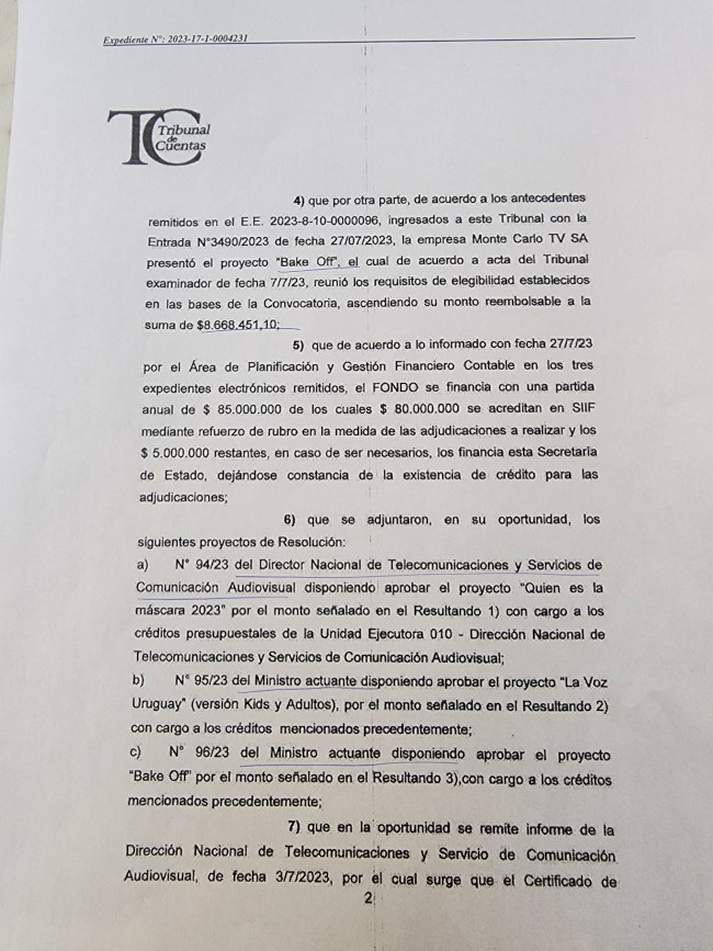 El Tribunal de Cuentas (TCR) observó al Ministerio de Industria, Energía y Minería (MIEM) el gasto de más de 50 millones de pesos para financiar 3 programas en canales privados nacionales: ¿Quién es la máscara? (Canal 12), La voz (Canal 10) y Bake off (Canal 4), todas producciones nacionales pero con formatos extranjeros: recibieron un reembolso luego que el ministerio realizara modificaciones que les permitieron cumplir con los requisitos, según informó MVD Noticias.