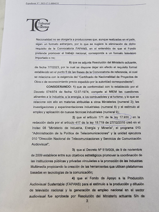 Según el colega Diego Martini, del noticiero de TV Ciudad, una vez abierta la convocatoria al fondo, el Ministerio de Industria, Energía y Minería solicitó que los formatos extranjeros pudieran obtener el subsidio, por lo que cambió la normativa.