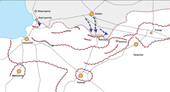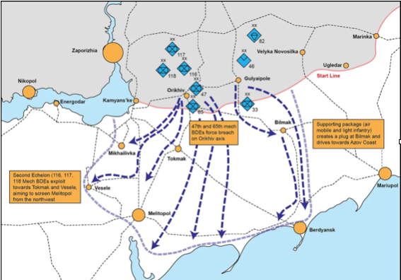 La intención parece haber sido forzar una brecha en la línea rusa mediante un asalto blindado concentrado de las Brigadas 47.ª y 65.ª, tras lo cual una fuerza de seguimiento compuesta por las Brigadas 116.ª, 117.ª y 118.ª comenzaría la fase de explotación. hacia la costa de Azov y las localidades de Mykhailivka y Vessele en el oeste. El objetivo claramente no es empantanarse en combates urbanos tratando de capturar lugares como Tokmak, Berdyansk o Melitopol, sino rodearlos y atravesarlos tomando posiciones de bloqueo en las carreteras principales.