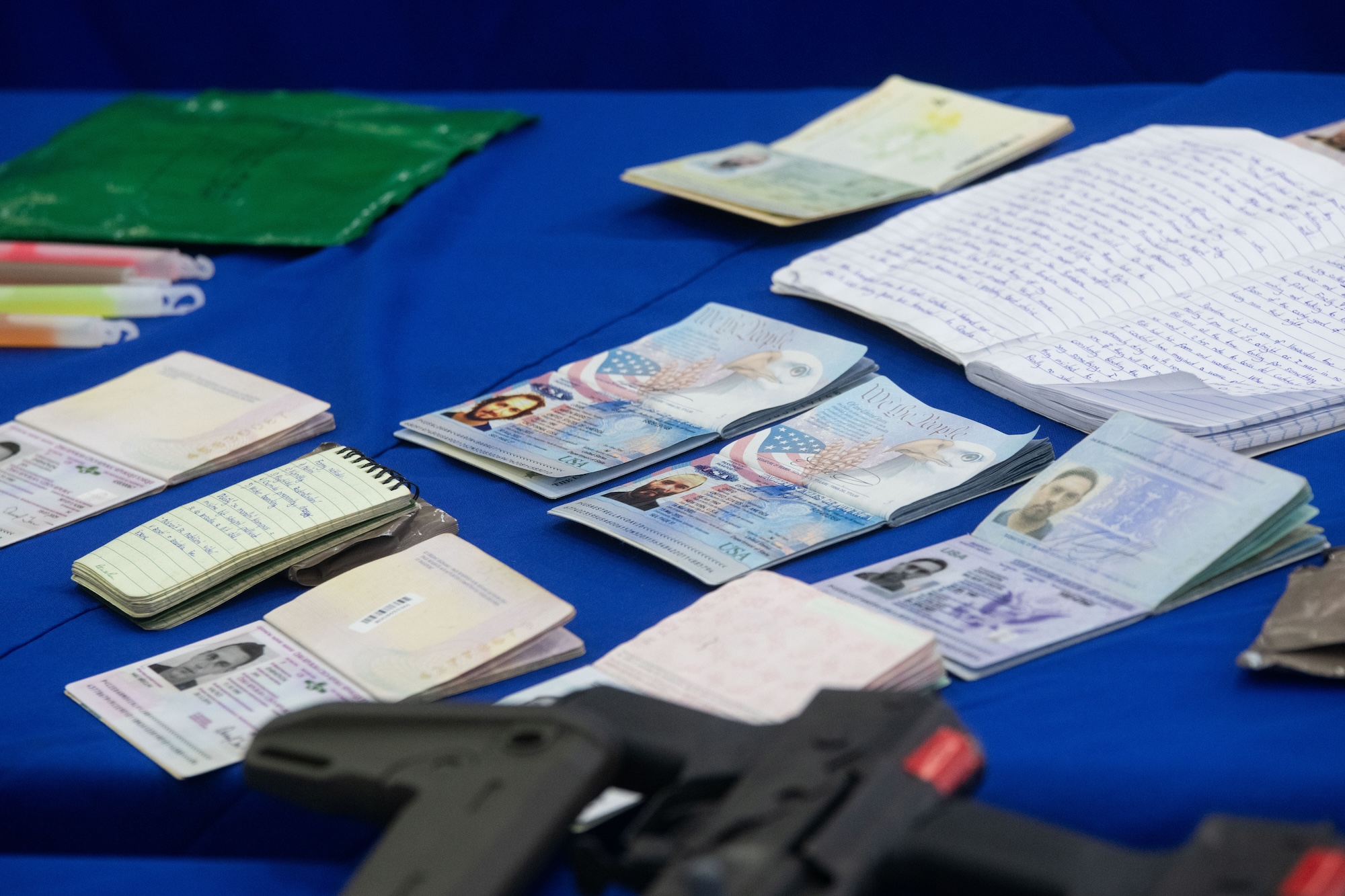 Pasaportes de detenidos durante la incautación de armas presentados durante una rueda de prensa, en Caracas, Venezuela. (Xinhua/Marcos Salgado)