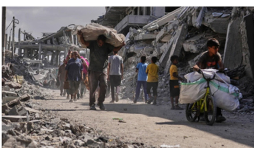 Imagen: De regreso a casa, o al menos a lo que queda de ella: Palestinos desplazados caminan con sus pertenencias frente a edificios destruidos mientras regresan a sus antiguas residencias en Khan Younis, al sur de la Franja de Gaza, el viernes 10 de octubre de 2025. | Jehad Alshrafi / AP