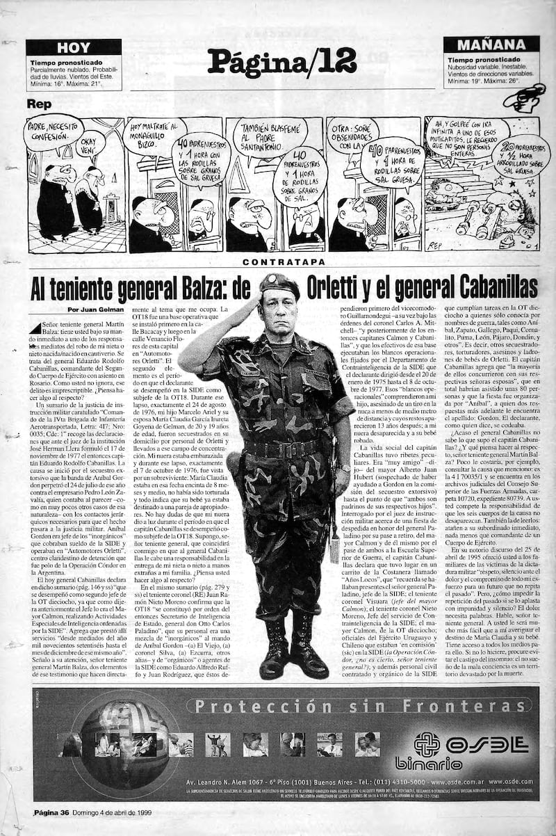 Marcelo Ariel y su esposa María Claudia García Irureta Goyena de Gelman, de 20 y 19 años de edad, fueron secuestrados en su domicilio por personal de Orletti y llevados a ese campo de concentración. Mi nuera estaba embarazada y durante ese lapso, exactamente el 7 de octubre de 1976, fue vista por un sobreviviente: María Claudia estaba en esa fecha encinta de 8 meses y medio, no había sido torturada y todo indica que su bebé ya estaba destinado a una pareja de apropiadores. No hay dudas de que mi nuera dio a luz durante el período en que el capitán Cabanillas se desempeñó como subjefe de la OT18. Supongo, señor teniente general, que coincidirá conmigo en que al general Cabanillas le cabe una responsabilidad en la entrega de mi nieta o nieto a manos extrañas a mi familia. ¿Piensa usted hacer algo al respecto?