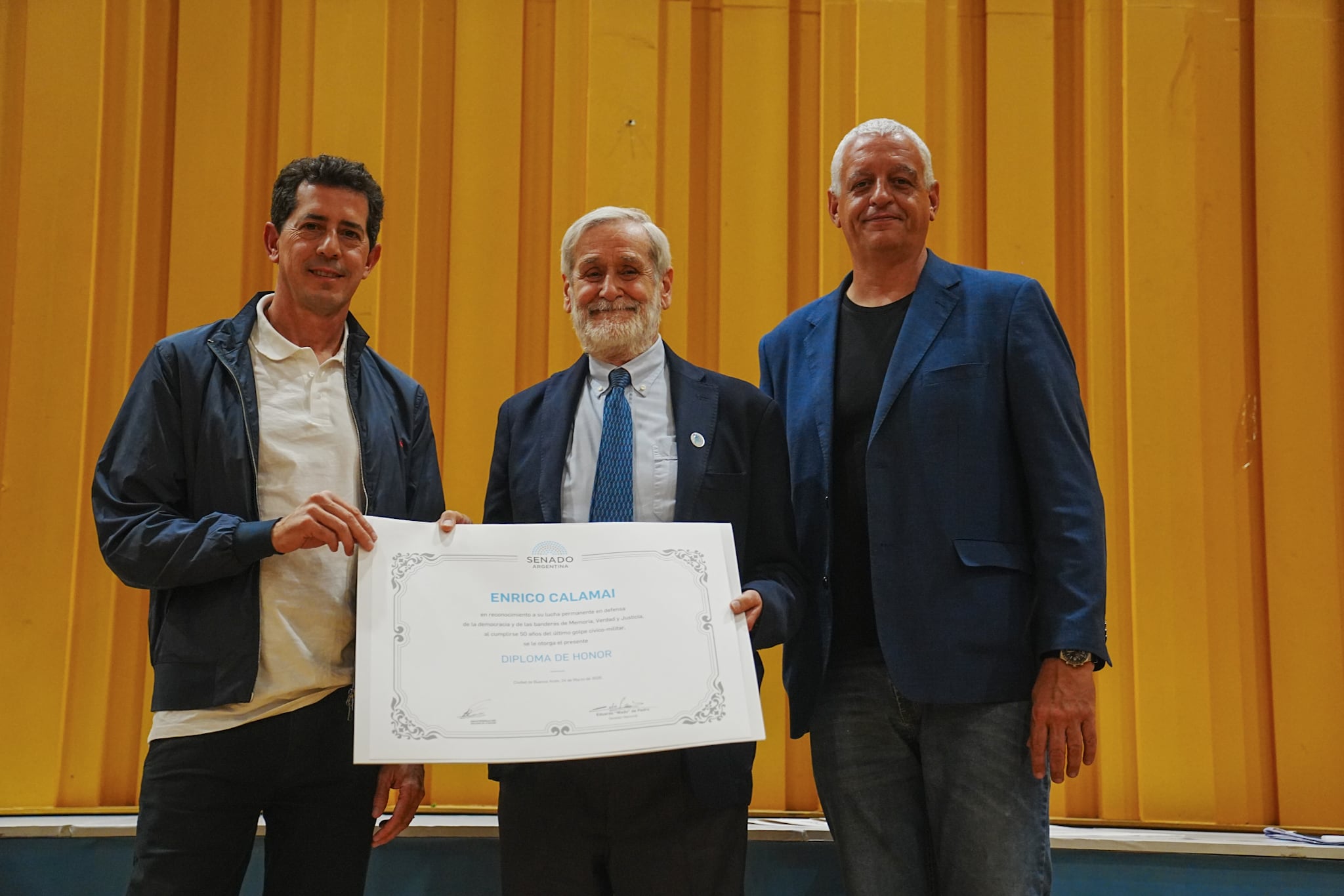 Durante su estadía en Argentina, Calamai no solo se emocionó profundamente al participar como invitado especial de la marcha del 24 de marzo y de su escenario. También recibió distintos reconocimientos como el “Sara Solarz de Otasinsky”, entregado por el Colectivo de Sobrevivientes Testimoniantes de la Esma, por su “ejemplo de coraje y solidaridad“.